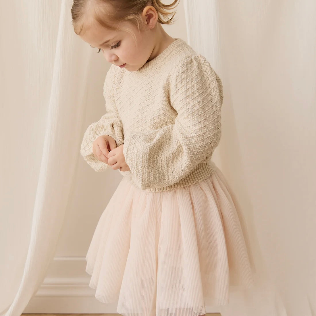 The Jardine Skirt – Blushed Rose is a beautifully delicate piece designed to bring softness and charm to your little one’s wardrobe. Featuring a light blushed rose hue, this skirt is crafted with a soft pleated tulle overlay and a breathable cotton lining. The elastic waistband ensures a comfortable fit, while the airy silhouette adds a whimsical touch—perfect for twirling, dressing up, or everyday play.